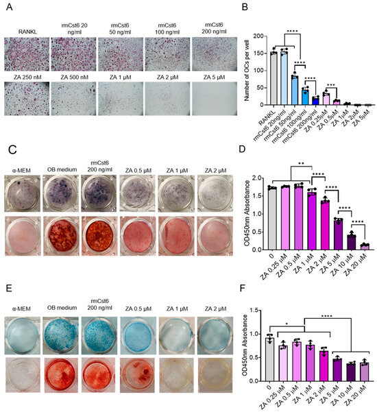 While ZA was shown to effectively suppress osteoclastogenesis through cell death, there is controversial evidence suggesting ZA can impact osteoblast function [5,10]. To evaluate the effects of rmCst6 and ZA on osteoblast cell viability and differentiation, mouse osteoblast progenitor MC3T3-E1 cells were exposed to different doses of ZA and 200 ng/mL rmCst6, the most effective dose for preventing osteoclast differentiation. Alkaline phosphatase (ALP), a relatively early marker of osteoblast differentiation, staining was performed to assess the effects of ZA and CST6 on the MC3T3-E1 differentiation. Following 14 days of treatment, ALP staining showed that ZA, but not CST6, significantly suppressed the osteoblast differentiation (Figure 4C). The mineralization capacity of cultured osteoblasts treated with ZA and rmCst6 for 21 days were also evaluated using Alizarin Red assay. Again, ZA, but not rmCst6, significantly inhibited the formation of mineralized nodules in a dose-dependent manner (Figure 4C). Because of the effect of ZA on pre-osteoblast differentiation and mineralization, cell viability of MC3T3-E1 cells treated with increasing concentrations of ZA was analyzed. CCK-8 cell viability assay showed that ZA had a significant dose-dependent decrease in cell viability starting at 1 µM (Figure 4D). These data suggest that compared with rmCst6, ZA decreased the osteoblast activity and function.