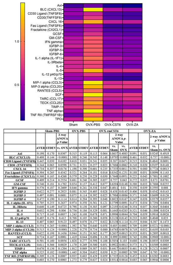 Inflammation is a key factor in osteoclastogenesis; as such, the anti-inflammatory effects (and thus the anti-bone resorptive effects) of the treatments used in this study (rmCst6 and ZA) as well as the proinflammatory effects of OVX were measured using an inflammatory cytokine array The 29 targets with the largest initial change in membrane intensity from the sham surgery group to the OVX-PBS group are shown (Figure 5). The anti-inflammatory effects of rmCst6 and ZA appear to be equivalent. Data and statistics for nine targets with the largest initial change in membrane intensity following OVX are listed in Table 3.