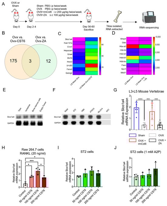 For the OVX model, it was shown that both rmCst6 and ZA ameliorated OVX-induced inflammation (and thus potentially bone resorption) back to sham surgery levels. To determine the mechanisms by which rmCst6 and ZA suppress bone resorption, sequencing analysis of RNA isolated from the tibia of OVX mice treated with either rmCst6 or ZA was performed (Figure 6A). Between the OVX-PBS and the OVX-rmCst6 treatment groups, there were 175 differentially expressed genes unique to the rmCst6 treatment; between the OVX-PBS and the OVX-ZA treatment groups, there were 12 differentially expressed genes unique to the ZA treatment, and there are three differentially expressed genes shared between both OVX-PBS vs. OVX-rmCst6 and OVX-PBS vs. OVX-ZA (Figure 6B). The 10 genes with the largest fold compared with OVX-PBS are listed for both the rmCst6 and ZA treatment (Figure 6C,D). Of particular interest, for rmCst6 treatment, the solute carrier organic anion transporter family member 1a4 (Slco1a4), an organic anion transporter that also facilitates estrogen influx, had the largest fold increase (log2 fold = 3.60), while for ZA treatment, MMP9, which plays a role in apoptotic pathways, had the greatest fold increase (log2 fold = 3.33) [22,23]. Since ZA is known for its apoptotic effects on bone cells, the effect of rmCst6 on Slco1a4 gene expression was investigated further. Basal Slco1a4 RNA levels were found for different bone tissues and cells using PCR and agarose gel electrophoresis (Tissue: tibia, vertebrae, isolated bone marrow cells, and empty femur; Cell types: Raw 264.7, ST2, OB6, ATDC5, and MLOY4) (Figure 6E,F). Real-time PCR for RNA isolated from OVX mice L3–L5 vertebrae matched RNA-seq results; mRNA levels were decreased following OVX, and only rmCst6 treatment brought Slco1a4 mRNA back to sham surgery levels (Figure 6G). To determine cell types where rmCst6 treatment increases Slco1a4 gene expression, real-time PCR was performed for macrophage Raw 264.7 cells (±20 ng/mL RANKL) and stromal ST2 cells (±1 mM A2P). For Raw 264.7 cells, only rmCst6 (+20 ng/mL RANKL) displayed a dose-dependent increase in Slco1a4 mRNA levels up to 100 ng/mL rmCst6 (Figure 6H). rmCst6 treatment also increased Slco1a4 mRNA levels in osteoblast precursor ST2 cells (±1 mM A2P); however, based on one-way ANOVA, changes were not considered significant (Figure 6I,J). Normalized log(2) gene expression for RNA-seq data is listed in supplemental file S1.
