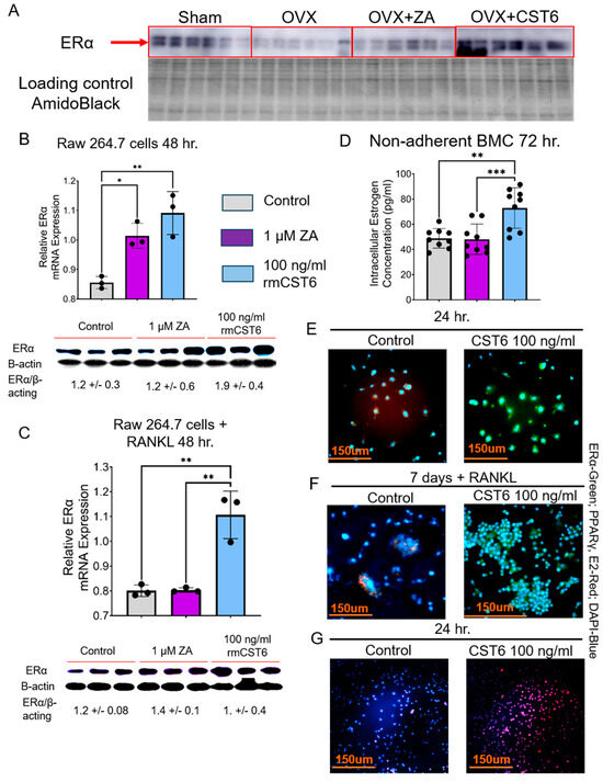 ERα expression in bone tissue and cells and intracellular total estrogen levels in osteoclast precursors are increased following treatment with rmCST6. (A) ERα protein levels are decreased in L3–L5 vertebrae of OVX mice, and expression is brought back to sham surgery levels only by rmCst6 treatment (n = 6). Amido black staining was used as a loading control. (B) Raw cells treated with either 1 µM ZA or 100 ng/mL of rmCST6 for 48 h had increased mRNA and protein levels of ERα when compared with control-treated samples (n = 3). Protein level significance was analyzed using one-tailed t-test (Table 4). (C) Raw cells treated with 1 µM ZA or 100 ng/mL of rmCst6 for 48 h (20 ng/mL RANKL) had increased mRNA and protein levels of ERα when compared with control-treated samples (n = 3). Protein level significance was analyzed using one-tailed t-test (Table 5). (D) Total intracellular estrogen levels (E1, E2, E3) for cultured osteoclast precursor cells isolated from mouse femur were increased for only 100 ng/mL rmCst6 treatment. Estrogen concentration was normalized to total protein lysate concentration. Graph is the result of triplicate experiments (n = 9). Three ELISA plates were scaled to each other by dividing estrogen concentration (pg/µg) for each sample by average estrogen concentration of control treatment for said plate, then multiplying by the average estrogen concentration for all samples across three plates. (E) Immunohistology staining of Raw 264.7 cells incubated for 24 h treated with PBS control solution or 100 ng/mL rmCST6. Cells treated with rmCst6 showed increased expression of ERα, whose transcription is known to be upregulated by estrogen, and decreased expression of PPARγ, whose transcription is known to be downregulated by estrogen. (F) Immunohistology staining of Raw 264.7 cells incubated for 7 days treated with PBS control solution or 100 ng/mL rmCst6 (20 ng/mL RANKL). Cells treated with rmCst6 showed increased expression of ERα and decreased expression of PPARγ. (G) Estrogen influx is increased in Raw 264.7 cells by 24 h rmCst6 treatment. Raw 264.7 cells were plated onto tissue culture-treated slides (Lab-Tek Chamber Slide System, 177437; Nalge Nunc International, Naperville, IL 60563, USA) at a concentration of 2.5 × 105 cells/mL and treated with PBS (left panel) or 100 ng/mL rmCst6 (right panel) and 1 pm Estradiol glow (E2 Glow, Jena Bioscience, PR-958S) for 24 h. After 24 h, media was aspirated, and cells were fixed with cold 4% paraformaldehyde for 20 min and rinsed with PBS. Following this, cells were covered with DAPI-Fluoromount-G and observed using a Nikon Eclipse T/2 epifluorescent microscope. DAPI ex wavelength: 350 nm, em wavelength: 470 nm; E2 Glow ex wavelength: 467 nm, em wavelength: 618 nm. Data represented as mean ± SD analyzed by one-way ANOVA with Tukey’s multiple comparisons. Denoted markings are considered significant * p < 0.05, ** p < 0.01, *** p < 0.001.