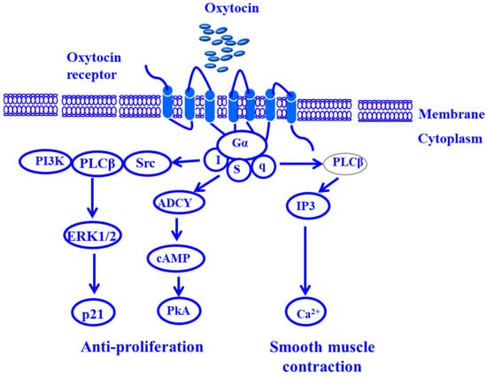 External stimulation of the oxytocin receptor by its ligand triggers three different pathways via Gαi-dependent mechanisms that lead to the enhancement of the antiproliferative effect and the contraction of smooth muscle [281,312]. Thus, the antiproliferative effect induced by oxytocin is mediated by PLCβγ, leading to sustained phosphorylation of ERK1/2 and subsequent expression of the cyclin-dependent kinase inhibitor p21-dependent signaling pathway, and by cyclic adenosine monophosphate (cAMP), leading to activation of the protein kinase C (PKC)-dependent pathway [313,314,315]. Meanwhile, oxytocin-induced smooth muscle contraction is mediated by the activation of the PLC signaling pathway, which leads to the release of PIP2 to IP3 and DAG to activate PKC, and by increasing calcium release from the sarcoplasmic reticulum, which activates the calmodulin complex, which enhances the activation of MLC, leading to contraction [315].