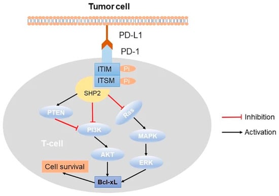 Immune pathway of PD/PD-L1 pathway. The binding of PD-1 and PD-L1 leads to the phosphorylation of the ITIM and ITSM motifs in the intracellular domain of PD-1. This phosphorylation recruits the tyrosine phosphatase SHP-2, which inhibits the PI3K/AKT and Ras/MAPK/ERK signaling pathways, resulting in T-cell death [10].