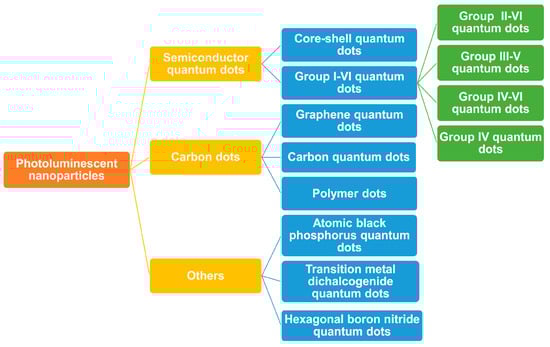 QDs are categorised by composition, consisting of either single-element materials like silicon and germanium or compound semiconductors, such as CdSe, CdTe, lead sulfide (PbS), lead selenide (PbSe), and carbon materials. Photoluminescent nanoparticles are classified into different types: semiconductor QDs (SQDs), carbon dots (CDs), and others [15]. The detailed classification is given in Figure 1.