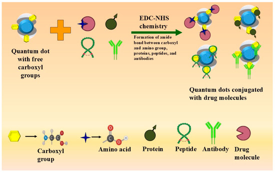 - EDC-NHS (N-hydroxy succinimide) chemistry: Employing 1-ethyl-3-dimethylamino propyl carbodiimide hydrochloride (EDC) as a cross-linker to form an amide bond between the carboxyl group of QDs and the amine group of the biomolecule [64]. This method is commonly used for targeting cells through receptor-mediated endocytosis and folate receptor-mediated delivery [65]. Figure 2 depicts the covalent conjugation.