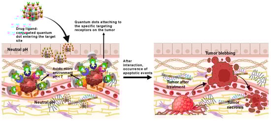 This schematic illustrates the targeted action of drug-ligand-conjugated QDs in delivering chemotherapeutic drugs to varied cancers that bind to specific receptors on tumour cells in an acidic tumour microenvironment (pH < 7). Upon entering the tumour site, QDs release the drugs, leading to enhanced tumour treatment outcomes, as shown by tumour blebbing and necrosis post-treatment.