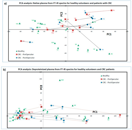 - Yao, H.; Shi, X.; Zhang, Y. The use of FTIR-ATR spectrometry for evaluation of surgical resection margin in colorectal cancer: A pilot study of 56 samples. J. Spectrosc. 2014, 2014, 213890. [Google Scholar] [CrossRef]