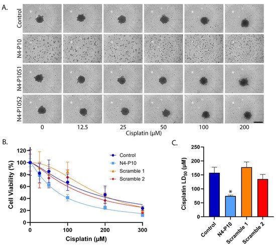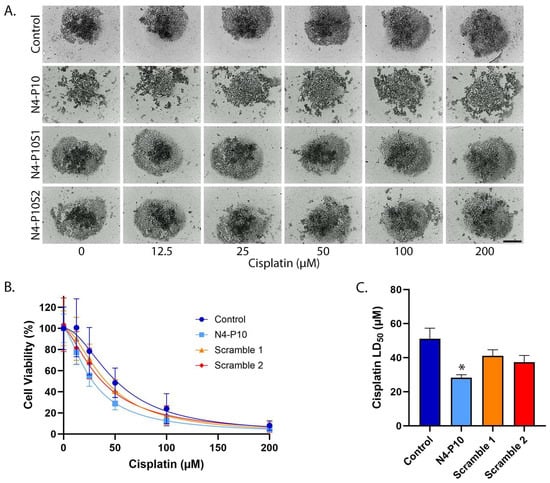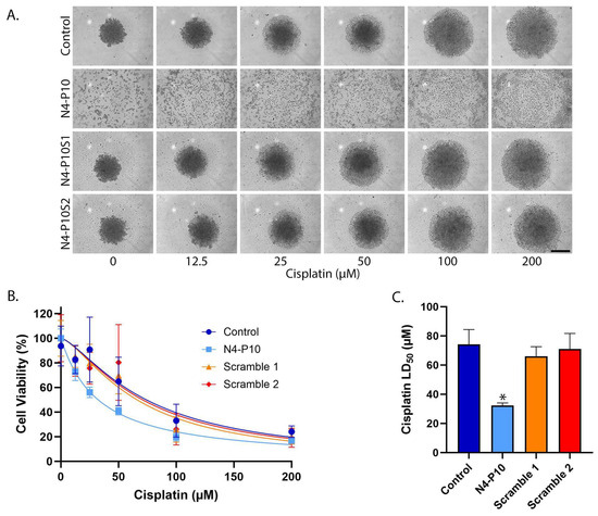 Nectin-4 peptide N4-P10 inhibits spheroid formation and increases cisplatin sensitivity in ME-180 cells. (A) Representative images of ME-180 spheroids 24 h after treatment with increasing concentrations of cisplatin. Scale bar = 400 µm. (B) Cell viability was plotted against the cisplatin concentration to determine the LD50 for cisplatin in the presence of peptide N4-P10, N4-P10 scrambled peptides (N4-P10S1 and N4-P10S2), or DMSO (control). The graph shown is the average of three independent experiments; each experiment had eight replicates per treatment. Luminescence readings were normalized against the cell viability in wells without cisplatin (plotted as 100% viable). The average luminescence of the blank defined 0% viability. Nonlinear regression was used to determine LD50 with 95% confidence intervals. Error bars = SD. (C) The average LD50 for cisplatin for ME-180 cells pre-treated with peptide N4-P10, N4-P10 scrambled peptides (Scramble 1 and Scramble 2), or control (DMSO), calculated from the nonlinear regression analysis shown in B. Error bars = 95% confidence intervals (* p < 0.05).