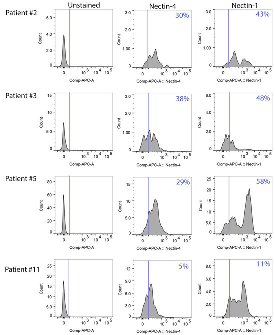We used flow cytometry to determine the levels of Nectin-4 and Nectin-1 on the surface of the ascites cells. The majority of the single cells (77–90%) were viable as determined by LIVE/DEAD™ Fixable Aqua viability stain. Patient samples expressed varying levels of Nectin-4 and Nectin-1 (Figure 4). Overall, the cell surface expression of Nectin-1 was higher than for Nectin-4; from 11% to 58% of viable cells expressed Nectin-1 compared to 5–38% of cells staining positive for Nectin-4. Patient #5 had the highest percentage of cells that expressed Nectin-1 (58%), and patient #3 had the highest percentage of cells that expressed Nectin-4 (38%). In contrast, patient #11 had the lowest percentage of cells that expressed nectins; only 5% of the cells stained positive for Nectin-4 and only 11% of the cells stained positive for Nectin-1.