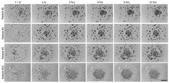 Cells that were isolated from ovarian cancer patient ascites fluid form aggregates in vitro. Single cells isolated from the ascites of four ovarian cancer patients were plated at 5000 cells/well in 96-well round-bottomed ultra-low-attachment plates and monitored in the IncuCyte SX5 imaging system. Representative images are shown at 0, 1, 2, 4, 6, and 12 h after plating. A subset of the cells did not form aggregates, as seen by the circular collection of single cells visible at the bottom of the wells. Scale bar = 400 µm.