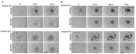 Cells isolated from the ascites of patients with HGSOC were passed through a 40 µm cell strainer to remove large aggregates. Single cells were then plated into 96-well round-bottomed ultra-low-attachment plates and monitored in the IncuCyte imaging system for several days. Many of the ascites cells began to form small aggregates within 1 h, which increased in size with continued incubation (Figure 5). Small aggregates were present initially (at T = 0) in some samples (e.g., patient #11); these spheroids also increased in size over time. However, a subset of the ascites cells was unable to form aggregates, as seen by the circular collection of single cells visible at the bottom of the wells. With longer incubation times, the cells from patients’ ascites formed multiple, tight aggregates. The ascites cells of two patients (#3 and #11) formed tight aggregates after 48 h in culture (Figure 6A), while the ascites cells from the other two patients (#2 and #5) required 72 h to form tight aggregates (Figure 6B). When cultured in the presence of peptide N4-P10, the size of the aggregates was visibly smaller for all four patients’ cells, demonstrating that cell aggregation was inhibited by peptide N4-P10 in the patients’ samples (Figure 6).