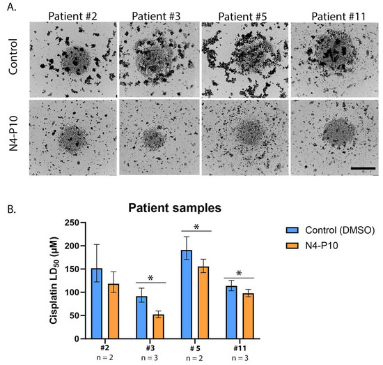 Patients’ ascites cells were then tested to determine whether pre-treatment with peptide N4-P10 would increase their sensitivity to cisplatin (Figure 7). Cells were plated at 5000 cells/well in 96-well round-bottomed ultra-low-attachment plates in the presence of 400 µg/mL peptide N4-P10 or an equivalent volume of DMSO (control). The cells were incubated for 48 h (patients #3 and #11) or 72 h (patients #2 and #5) to allow for the formation of compact spheroids (Figure 7A). Increasing concentrations of cisplatin were added and the cells were incubated for 24 h. Cell viability was measured to calculate the LD50 with 95% CI for cisplatin for each patients’ cells (Figure 7B). The cisplatin LD50 ranged from 92 µM to 191 µM for the patients’ cells treated with DMSO (control) compared to a range of 52 µM to 155 µM cisplatin for patients’ cells treated with peptide N4-P10. Overall, this resulted in an average decrease in cisplatin LD50 of 24% in replicate experiments, with a significantly lower LD50 (p < 0.05) for patients #3, #5, and #11. The LD50 for patient #2 also decreased; however, the decrease was not statistically significant (p = 0.094).