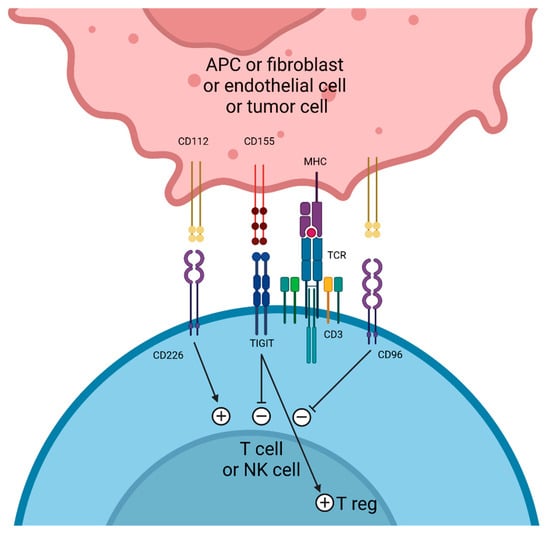 TIGIT (also known as WUCAM, VSTM3, or Vsig9) is an inhibitory molecule expressed on CD4 and CD8 T lymphocytes, Treg lymphocytes, and NK lymphocytes [90,91,92]. The expression of TIGIT by Treg lymphocytes is involved in their immunosuppressive functions. Tregs expressing TIGIT present an activated phenotype and express a high level of immunosuppressive markers, such as FoxP3, CTLA-4, PD-1, TIM-3, and LAG-3 [93]. TIGIT binds primarily to the CD155 receptor, also known as the polio virus receptor (PVR), which is expressed on monocytes, dendritic cells (DCs), fibroblasts, endothelial cells, and tumor cells from many cancers [94]. TIGIT also binds, albeit with less affinity, to CD112, also known as Nectin-2, which is expressed on DCs, monocytes, and numerous tumor cell subtypes. TIGIT ligands (CD155 and CD112) are shared with CD96 and CD226, which cause co-inhibition and co-stimulation signals, respectively. TIGIT competes with CD226 for binding to CD155 and presents higher affinity to CD115 than CD226 (Figure 2).