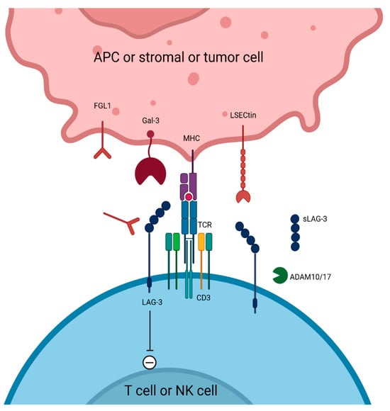 Lymphocyte activation gene-3 (LAG-3, reviewed in references [120,121,122]), also known as CD223, is a type I transmembrane protein located on human activated CD4 T cells, CD8 T cells, NK cells, gamma/delta T cells, and plasmacytoid DCs, as well as on rested/activated Tregs. Although LAG-3 and CD4 have a homologous structure, the two receptors share only 20% of their amino acid sequence. Singularly, LAG-3 is a non-ITIM IR that functions through critical “KIEELE” and “EP” motifs on the cytoplasmic tail [123]. LAG-3 on immune T cell lines or NK cells binds to several ligands, among which class II major histocompatibility complex (MHC-II) is the canonical one. Additionally, in the cancer context, LAG-3 also binds fibrogen-like protein 1 (FGL1) released by cancer cells [124], galectin-3 on tumor and tumor-associated stroma cells [125], and LSECtin on tumor cells [126]. Mechanistically, LAG-3 acts as an IR through several immunosuppressive functions (Figure 3). Firstly, it impairs the functionality of immunocompetent adaptive cells. LAG-3 may constitutionally associate with the TCR-CD3 complex in CD4 and CD8 T cells, independently of the presence of MHC-II, although it is the canonical LAG-3 ligand. After TCR stimulation, LAG-3 and TCR colocalization rapidly increases within the immune synapse, further limiting CD4 and CD8 T cell activation and expansion. Mechanistically, the LAG-3 cytoplasmic tail disrupts LcK-CD4 or LcK-CD8 interaction, thereby inhibiting TCR signaling [123,127]. Beyond the membrane receptor structure, LAG-3 is shed at the cell surface in a soluble form (sLAG-3) by ADAM10 on rested/activated T cells, and ADAM17 on activated T cells only. This sLAG-3 release through metalloproteinase cleavage promotes an antitumor immune response and is required for T cell function [128].