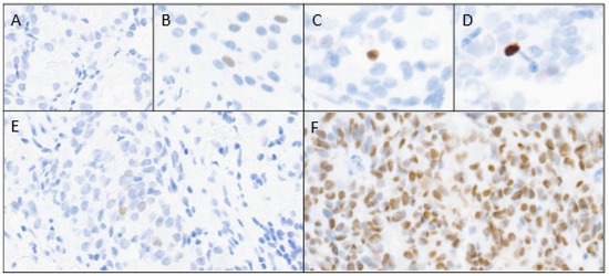 p53 nuclear expression scoring; intensity (A–D) and percentage (E,F) of tumor. (A) 0 (absent); (B) 1+ (light); (C) 2+ (medium); (D) 3+ (maximum); (E) ≤5%; (F) >5%.