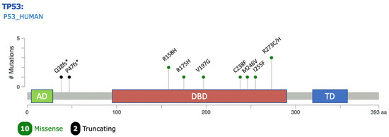 Lollipop plot showing position and frequency of mutations in TP53 observed in the study across protein domains. Plot generated using the Mutation Mapper tool in cBioportal [33]. AD: transactivation domain; DBD: DNA binding domain; TD: tetramerization domain.