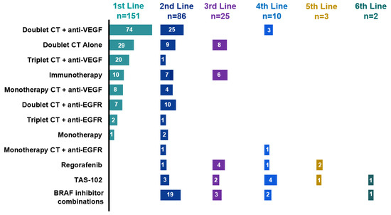 Therapeutics according to treatment line. Doublet CT, doublet chemotherapy (FOLFOX, XELOX, FOLFIRI); triplet CT, triplet chemotherapy (FOLFIRINOX); monotherapy CT, monochemotherapy (fluoropyrimidine, irinotecan); anti-EGFR (epidermal growth factor receptor), cetuximab or panitumumab; anti-VEGF (vascular endothelial growth factor), bevacizumab; BRAFi; BRAF inhibitors; ICI, immune checkpoint inhibitors; TAS-102, trifluridine plus tipiracil hydrochloride.