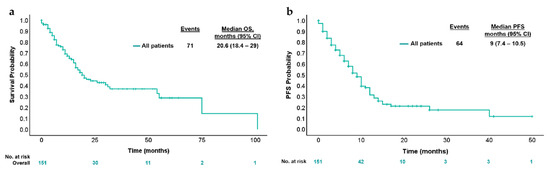 With a median follow-up of 23 months, the median OS was 20.6 months (95% CI 18.4–29 months) and median PFS was 9 months (95% CI 7.4–10.5 months) (Figure 2). Conforming different treatments in these circumstances, the median PFS for chemotherapy plus targeted therapy was 9 months (95% CI 7.1–10.8 months), chemotherapy alone was 10 months (95% CI 6.9–13 months) and for immune checkpoint inhibitors (ICI) was NR (95% CI NR) (p = 0.079) (Figure 3a). Median PFS was 4 months (95% CI 2.9–5.1 months) and 7 months (95% CI 5.5–8.4 months) [HR 1.4 95% (CI 0.8–2.3); p = 0.16] for patients who received triplet to doublet chemotherapy with or without targeted therapy, respectively (Figure 3b).