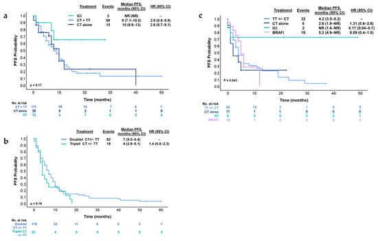 Kaplan–Meier estimates for (a) PFS according to treatment types in the first-line treatment. (b) PFS according to doublet chemotherapy or triplet chemotherapy in the first-line treatment. (c) PFS according to treatment type in the second-line treatment. BRAFi; BRAF inhibitors, CI, confidence interval; CT, chemotherapy; CT +/−, chemotherapy with or without; Doublet CT, XELOX, FOLFOX or FOLFIRI; HR, hazard ratio; ICI, immune checkpoint inhibitors; PFS, progression-free survival; Triplet CT, FOLFIRINOX; TT, targeted therapy (anti-EGFR or anti-VEGF).
