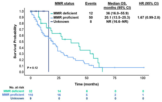 According to MMR status, the median OS was 20.1 months (95% CI 13.5–25.3 months) for MMR-proficient (pMMR) and 36 months (95% CI 16.0–55.9 months) for dMMR (HR 1.67 [95% CI 0.99–2.8]; p = 0.12) with a median FU of 20.1 months (Figure 4). Also, we compared PFS of patients with dMMR tumors who received ICI or other than ICI treatments in the first-line setting. The median PFS was NR (95% CI NR) for ICI and 6 months (95% CI 4.4–7.5 months) for non-ICI (HR 0.38 [95% CI 0.1–1.1]; p = 0.062).