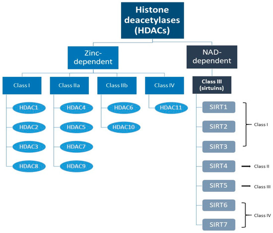 A specific form of PTM related to the control of gene expression is histone modification. In the 1960s, it was shown that acetylation of the internal lysine residue of a histone causes neutralization of the positive lysine charge, thereby relaxing the chromatin conformation and increasing transcriptional activity [33,34]. Deacetylation, on the other hand, involves hydrolysis of an acetyl group from an acetyl-lysine residue and is carried out by deacetylases, thus leading to chromatin condensation and gene expression silencing [30,35]. Histone deacetylases (HDACs) are important and well-described enzymes [36]. There are 18 known representatives of HDACs divided into four classes. Zinc-dependent classes include classes I (HDACs 1, 2, 3, and 8), IIa (HDACs 4, 5, 7, and 9), IIb (HDACs 6 and 10), and IV (HDAC 11). SIRT1-7 constitute NAD-dependent class III HDACs (Figure 1) [37,38,39].