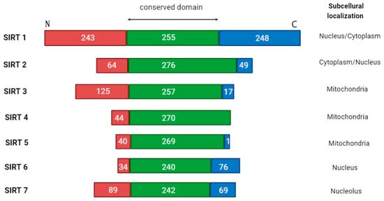 The overall architecture of SIRT1-7 domains. Human sirtuins have conserved catalytic cores (green center) and variable N- (red end) and C- (blue end) terminals. For each sirtuin isoform, the boundaries of the catalytic core were determined using UniProt. Differences in the cellular localization of each sirtuin are highlighted.