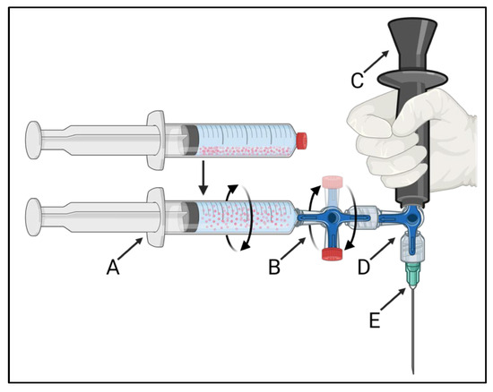 A schematic overview of the 360° syringe-rotating injection system that was used to create a homogeneous 165HoMS suspension and to inject constant concentrations. The injection system consists of a 165HoMS syringe (A) connected to a 360° rotating 3-way stopcock (B), enabling the syringe to be manually rotated over its long axis. The rotatable 3-way stopcock was connected to a second 3-way stopcock (D) with a handgrip (C) and needle attached (E) perpendicular to the 165HoMS syringe. Created with BioRender.com.