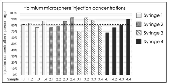 Bar graph of the 165HoMS concentration recovered (RHoMS-injection) after injection in 16 samples of 0.5 mL compared with the prepared syringe concentration. The black dotted line indicates a median recovered concentration of 81% (range: 69–93%).