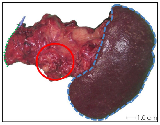 Photograph of the anterior side of ex vivo tissue sample 1 after pancreatic tail resection with splenectomy. Schematic estimations of the pancreatic resection surface (green dotted line), spleen (blue striped line), and rough approximation of the tumor (red circle) are shown. Accurate identification of the tumor by visual inspection was not feasible, and palpation was not sufficient for needle depth estimation.