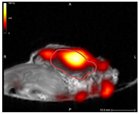 MRI quantification after nonradioactive intratumoral 165HoMS injection in sample 5, with a theoretical specific activity of 12.00 MBq/mg 165HoMS. The red line delineates the tumor. The highest dose, at the location of the 165HoMS deposition, was observed within the tumor. Multiple MRI artifacts caused inaccurate dose estimations surrounding the tissue, which were created by air and heterogeneous tissues. This figure was created in Q-Suite (version 2.1).