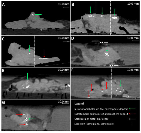 Post-injection CT from samples 4–10 (A–G), respectively. (B,C,F) contain multiple slices of the same plane and scale. Extratumoral holmium-165 microsphere deposits occurred and are visible in images (C,F,G), for samples 6, 9, and 10, respectively.