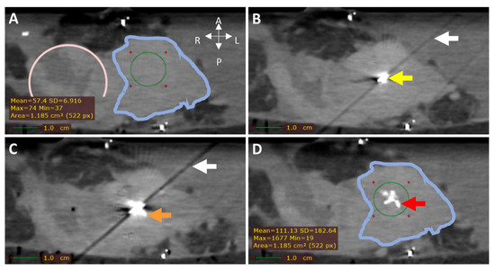CT (0.5 mm isotropic) of intratumoral 165HoMS injection in ex vivo pancreatic cancer sample 7. (A) CT before 165HoMS injection showing the sample anterior (left), posterior (right) (white arrows), duodenum (pink circle), tumor border approximation (blue contour), and HU values of interest (bottom left) in the region of interest (ROI; green circle). (B) CT with a 20G needle in situ. The needle tip is in the viewed slice, causing the hyperdense artifact (yellow arrow) and the diagonal shading artifact (white arrow in B,C). (C) CT scan directly following the injection of 11.5 mg of 165HoMSs in 0.7 mL suspension with the needle in situ. Deposition of 165HoMSs around the needle tip causes the hyperdense artifact to increase in size (orange arrow). (D) CT scan after needle extraction with 165HoMSs (red arrow) visible as hyperdense area in the center of the tumor (blue contour); HU values of interest (bottom left) in the region of interest (ROI; green circle). * Calcifications.