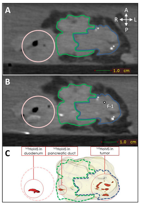 CT (0.5 mm isotropic) of intratumoral 165HoMS injection in ex vivo pancreatic cancer sample 9 (vertically aligned). (A) CT before 165HoMS injection showing the patient’s anterior (left), posterior (right) (white arrows), duodenum (pink circle), tumor border approximation (blue contour), and healthy pancreas border approximation (green contour). (B) CT scan directly following the injection of 13.4 mg of 165HoMSs in a 0.7 mL suspension with the needle removed. Leakage of the 165HoMSs occurred from the injection location (F-1, out of plane) through the pancreatic duct toward the duodenum. (C) Three-dimensional segmentation of the pancreatic head (beige), including the healthy pancreas and tumor, and the 165HoMSs (red).