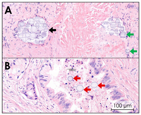 Hematoxylin–eosin staining of pancreatic cancer tissue after intratumoral holmium-165 microsphere (165HoMS) injection. Herein, purple-stained cell nuclei and gray–purple-stained 165HoMSs (±30 µm; circles) are visible. (A) Purple-stained tumor cell nuclei in a network of fibrosis (pink) with 165HoMS deposition in lymphatic lumen (black arrow) and interstitial lumen (green arrows). (B) 165HoMS deposition in a neoplastic duct (red arrows).