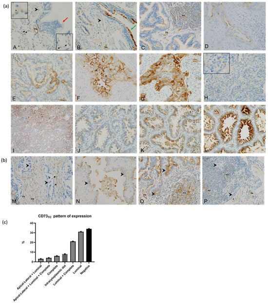 The tumour cells exhibited four patterns of expression of CD73: (i) complete membrane staining, (ii) apical–lateral staining, (iii) luminal staining (in glandular structures), and (iv) intracytoplasmic dot staining (Figure 1a). These patterns coexisted within the same tumour sample, observed in 28 out of 76 cases (37%) (Figure 1c). Among the evaluated cases, 50/76 (66%) exhibited positive membranous expression of CD73, with 24/50 (48%) showing complete membrane staining. The TPS ranged from 5% to 100% with a median of 10%, while the H-score varied between 0 and 280 with a median of 20. A high expression of CD73TC was detected in 12/76 samples (16%) based on the TPS and 11/76 samples (14%) based on the H-score. Both scoring methods yielded comparable results, with only one patient displaying discrepant values (TPS = 80%, H-score = 120) (Supplementary Figure S2). Given this consistency, all subsequent results are reported using the TPS.