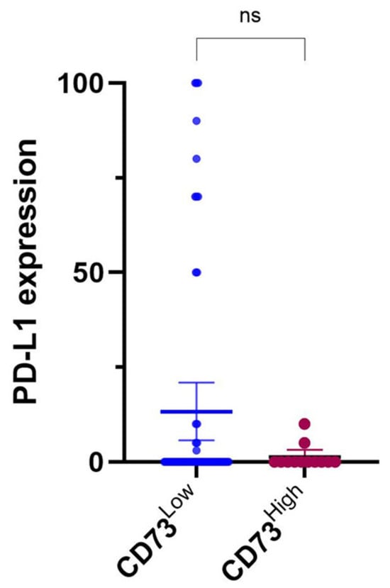 The Tumour Proportion Score (TPS) was calculated to determine the proportion of tumour cells expressing CD73. The TPS is defined as the percentage of viable tumour cells showing partial or complete membrane staining at any intensity and is calculated as follows: TPS = (Number of CD73 positive tumour cells/Number of total viable tumour cells) × 100. Expression levels with TPS values above 50% were classified as high, while those at or below 50% were considered low. Expression in stromal cells (CD73SC) was recorded as present or absent for lymphocytes, cancer-associated fibroblasts, and macrophages.