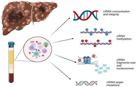 Several features of the cfDNA have been employed to develop assays that could be used as a readout for the diagnosis, prognosis and therapy of HCC. Specifically, approaches pertinent to the total quantity and integrity of cfDNA, alterations in its methylation status, DNA fragmentation, as well as detection of mutations have been used in this field [9].