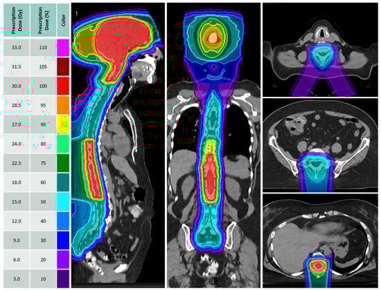 The median age was 58 years (range: 23–82), 84% were female and 68% were Hispanic. The median KPS was 90 (range 70–100). The most common primary tumor histologies were breast (23, 61%) and NSCLC (10, 26%). Actionable molecular alterations included human epidermal growth factor receptor 2 overexpression (HER2; 9, 24%), epidermal growth factor receptor mutations (EGFR; 4, 11%), and anaplastic lymphoma kinase rearrangement (ALK; 2, 5%). At LMD diagnosis, most patients had extracranial systemic disease (27, 71%). All patients had evidence of LMD on MRI scans involving both the brain and the spine (20, 53%) and mostly occurring synchronously with parenchymal brain metastases (32, 84%). Most patients had prior RT (23, 61%), overlapping with the intended pCSI plan in the brain (14, 37%), spine (3, 8%), or both (6, 16%) regions. Reduced-dose pCSI was delivered to reirradiated spinal regions in 9 patients at a dose of 18–25 Gy RBE in 6–10 fractions, as illustrated in Figure 1; no patients had prior whole-brain radiation therapy.