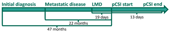 Timeline for milestones in the diagnosis and treatment course of patients treated with proton craniospinal irradiation (pCSI).
