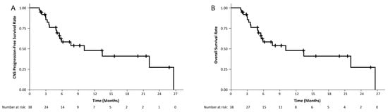 Kaplan Meier curves demonstrating CNS progression-free (A) and overall survival (B).On UVA, worse OS was associated only with lung versus other non-breast primary tumors (HR 5.76, 95% CI: 1.22–27.09, p = 0.03), while on MVA, it was associated only with positive CSF analysis (HR 3.40, 95% CI: 1.03–11.17, p = 0.04), as detailed in Table 3. Prior RT, dose reduction, and recent or concurrent administration of systemic therapy were not associated with either CNS-PFS or OS.