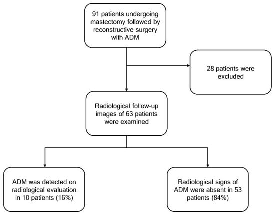 The initial study included 91 patients who underwent a mastectomy and BR with ADM; 28 patients were excluded based on the study criteria.