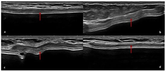 ADM features on US. ADM is observed as a peri-capsular hypoechoic thickening (red arrows) on the implant profile (a–d).