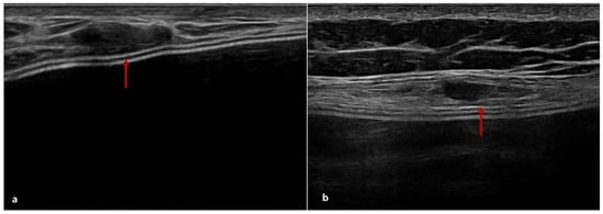 US provides valuable insights into the evolution of ADM characteristics post-surgery. Initially, ADM appears as a thin hypoechoic layer surrounding the implant, measuring approximately 0.3 to 0.6 mm at one month, which may thicken to 3 mm over time. A transient fluid collection between the ADM, implant, and subcutaneous tissue is often observed in the early postoperative period, gradually resolving as integration progresses. As the ADM assimilates into the surrounding tissue, it contributes to a thickened layer between the implant and the overlying skin [56,57]. In some cases, ADM may present as a focal hypoechoic area contiguous to the implant profile. This layer tends to be thinner over convex regions but may fold at the medial or lateral margins, forming nodular structures that could be misinterpreted as pathological [57].