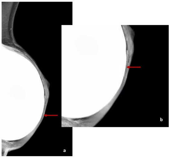 Only three patients underwent DM of the operated breast: one patient showed no radiological signs of ADM; two patients exhibited peri-implant linear thickening at T0, which completely disappeared at T1 in one case and reduced at T1 and almost completely disappeared at T2 in the other case (Figure 5 and Figure 6).