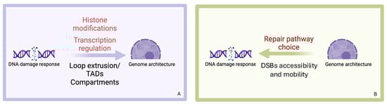 Following the formation of a DSB, nuclear architecture undergoes profound rearrangements to facilitate DNA repair. (A) At the local level, histone modifications, chromatin remodeling, and transcriptional regulation promote the cis-accumulation of repair factors. On a larger scale, inter-TAD and intra-TAD rearrangements enhance contacts in trans. (B) In turn, chromatin architecture can actively contribute to the DDR by influencing the repair pathway choice and increasing the accessibility and mobility of damaged loci, depending on the pre-existing chromatin context and/or the genomic location of DSBs. Created with BioRender.com (accessed on 7 March 2025).