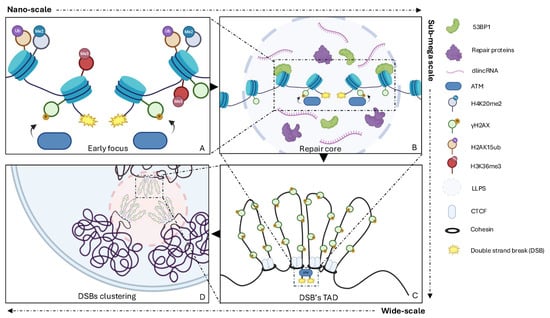 Stages of DSBs’ clustering. From nano-scale to sub-mega scale: (A) upon DSB, cis histone modifications are one of the earliest events at nano-scale level. (B) The formation of phase-separated repair cores, driven by the LLPS properties of 53BP1, facilitates the assembly of repair foci. From sub-mega scale to wide-scale: (C) repair foci form through the local rearrangement of chromatin at the level of TADs. The megabase-scale spreading of γH2AX is enabled by cohesin-mediated loop extrusion, which ensures ATM-dependent phosphorylation of H2AX across the entire TAD. (D) At a wider scale, γH2AX- and 53BP1-decorated damaged TADs can further fuse and self-segregate. This process relies on the actin network, the LINC complex embedded in the nuclear envelope, and PPPS properties of 53BP1. Created with BioRender.com (accessed on 7 March 2025).