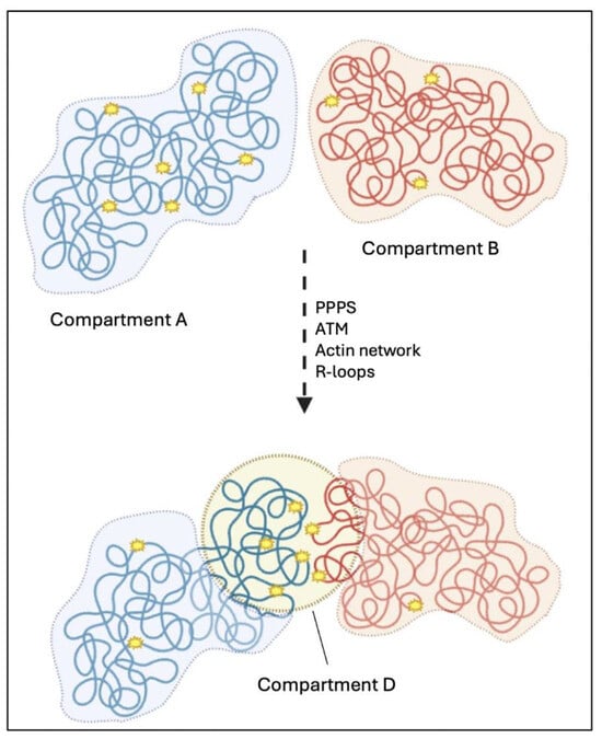 Schematic representation of D-compartments assembly following DSBs. Topologically associated domains (TADs) segregate into A and B compartments, in association respectively with active or inactive chromatin. Damaged TADs can form a specialized compartment, the ‘D compartment’, which is spatially isolated from the surrounding environment, through polymer–polymer phase separation (PPPS), ATM kinase activity, nuclear actin polymerization, and R-loop accumulation. Created with BioRender.com (accessed on 7 March 2025).