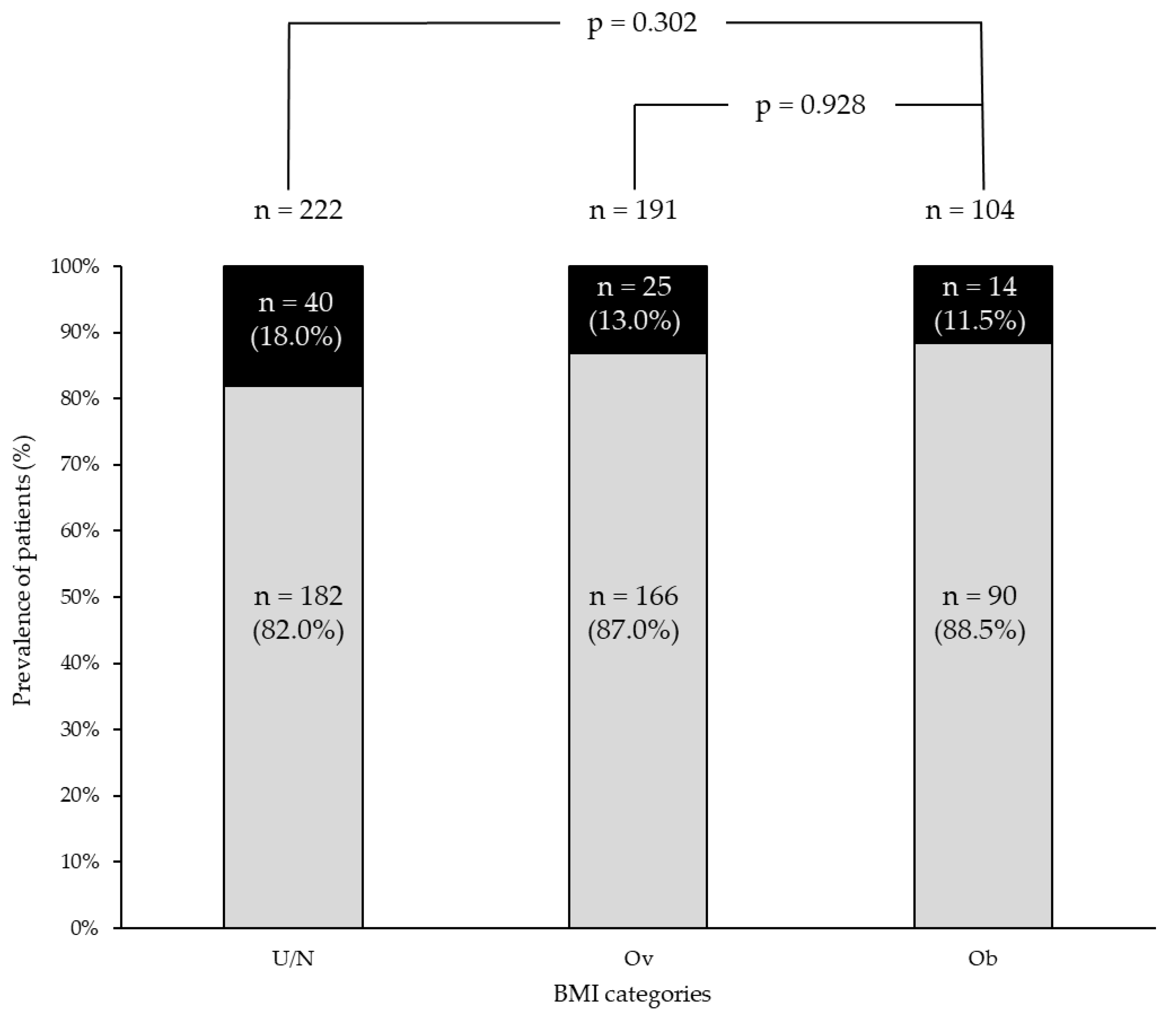 | U/N Group n = 229 (%) | Ov Group n = 193 (%) | Ob Group n = 107 (%) | p-Value U/N vs. Ov Group | p-Value U/N vs. Ob Group | p-Value Ov vs. Ob Group | ||