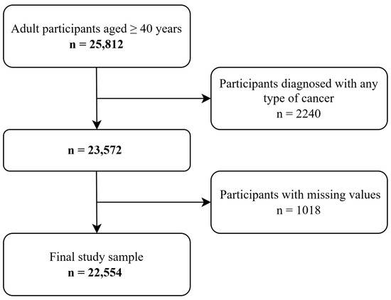 A diagram of the sample selection procedure is illustrated in Figure 1. This study included participants from the fourth and fifth waves of the KNHANES, conducted between 2007 and 2012. The rationale for this selection was that the data on detailed information regarding cancer screening by type were collected from 2007 to 2012. Since 2013, the KNHANES has not included measurements for categorizing screening participation by cancer type, preventing the use of more updated datasets. Among these participants, 25,812 middle-aged and older individuals aged ≥40 years were selected. Subsequently, those diagnosed with any type of cancer (n = 2240) and those with missing data (n = 1018) were excluded, resulting in a sample of 22,554 adults.