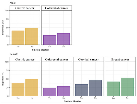 Various factors can influence participation in cancer screenings among individuals with suicidal ideation. For instance, individuals with poor mental health, including suicidal ideation, may have reduced motivation and interest in health screenings [18,19]. They may avoid or delay seeking necessary healthcare, which can lead to lower participation. Additionally, individuals with poor mental health often have poor socioeconomic status [20], where lower education and income levels may act as barriers to healthcare access. Moreover, individuals with suicidal ideation and poor mental health are often exposed to social stigma, which can deter them from visiting healthcare services and receiving appropriate care [21,22].