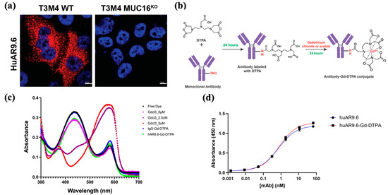 Targeting MRI conjugate. (a) Immunofluorescence (IF) staining for MUC16 using huAR9.6 on T3 M4 WT (MUC16+) and T3 M4 MUC16 KO isogenic PDAC cell lines; (b) synthesis of the antibody conjugate for MRI via conjugation of huAR9.6 and huIgG (isotype control) with DTPA and gadolinium chloride to yield antibody–Gd–DTPA; (c) the spectrometric distribution (300 nm to 700 nm) of standard Gd chloride, huIgG–Gd-DTPA and huAR9.6–Gd–DTPA conjugates; (d) enzyme-linked immunosorbent assay (ELIZA) depicting huAR9.6 and huAR9.6–Gd–DTPA binding affinity to MUC16 TR 1.2 (n = 3).